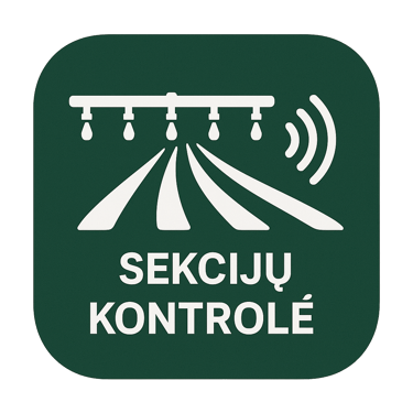 Sekcijų kontrolė, normos reguliavimas, technologinių vėžių valdymas, padargo sekimas pagal traktoriaus vėžias.